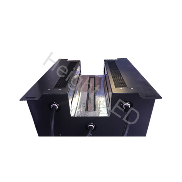 三面出光,頂部及左右兩側,照射面積都是300x20mm,頂部395nm,兩邊365nm,散熱方式:風冷